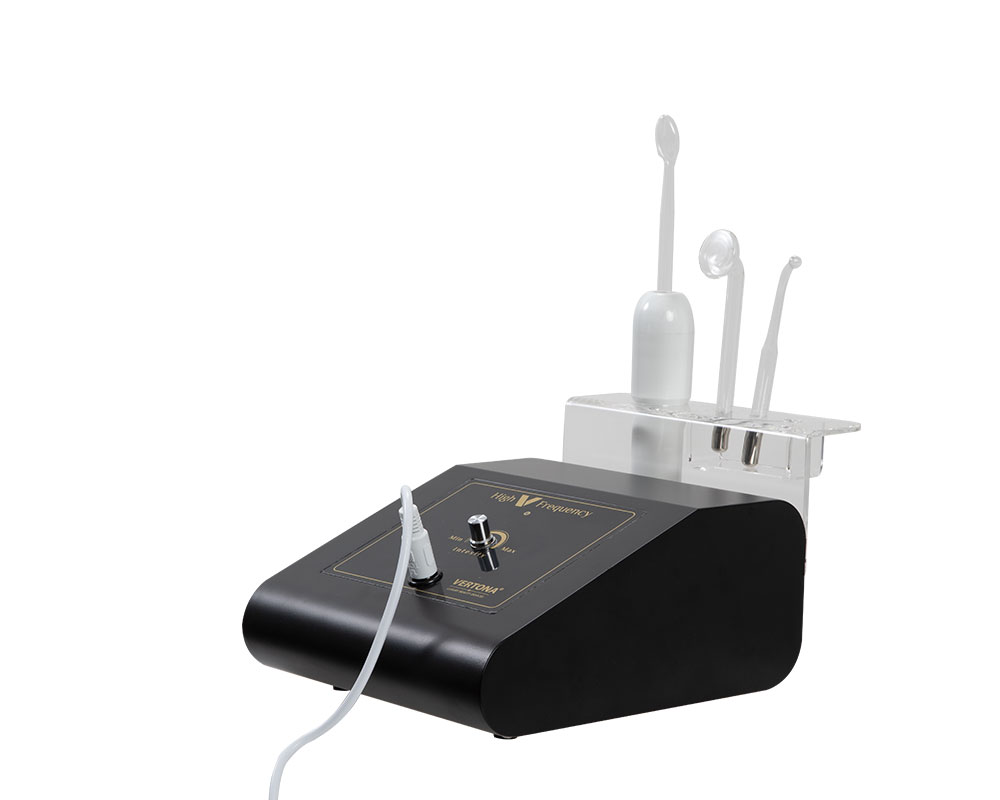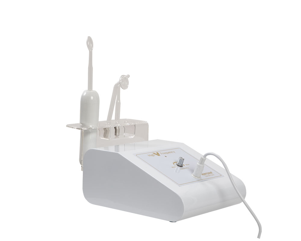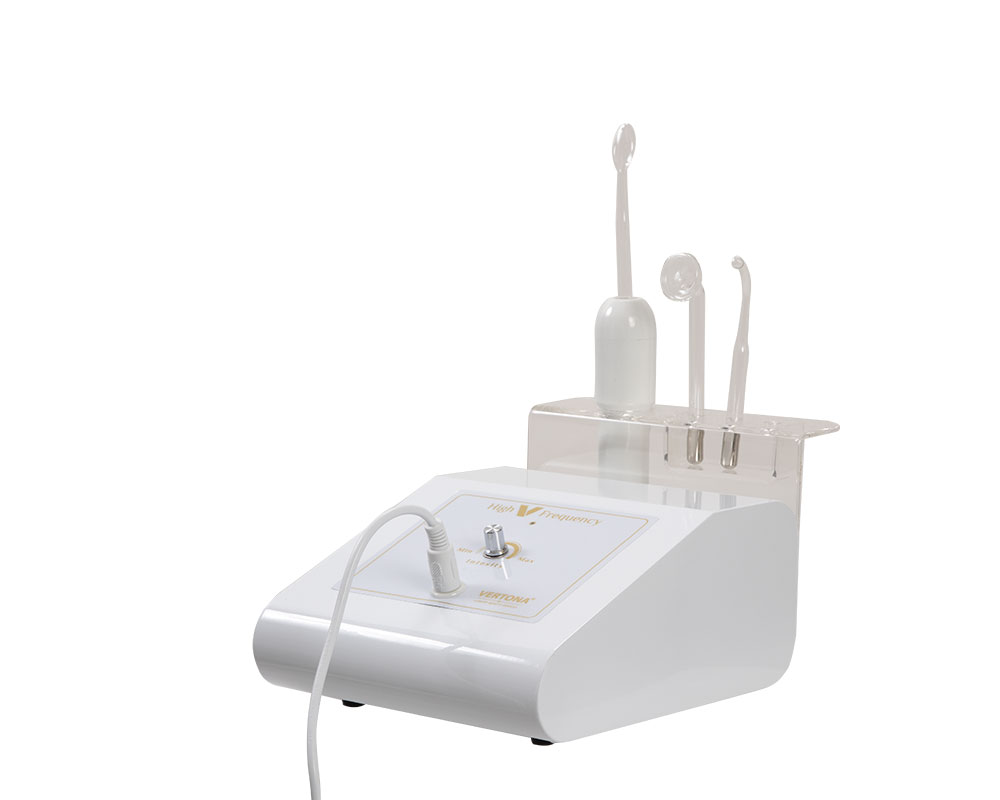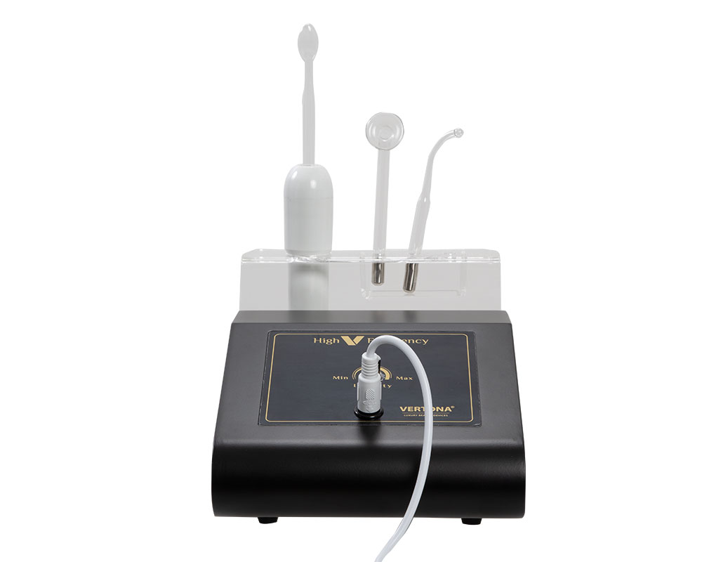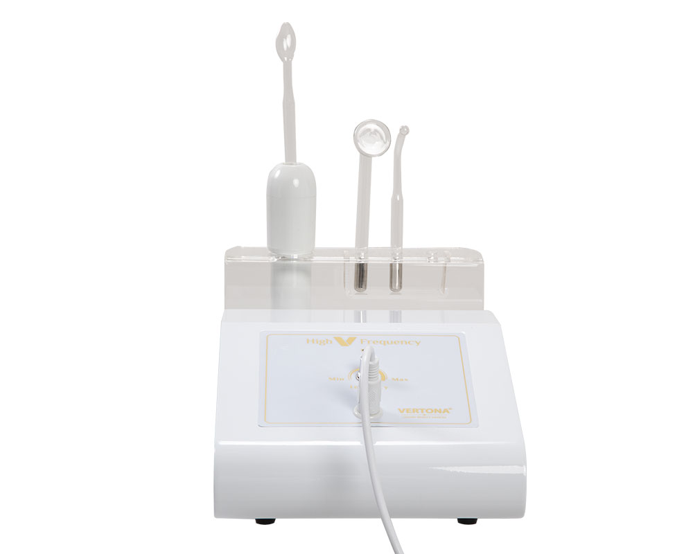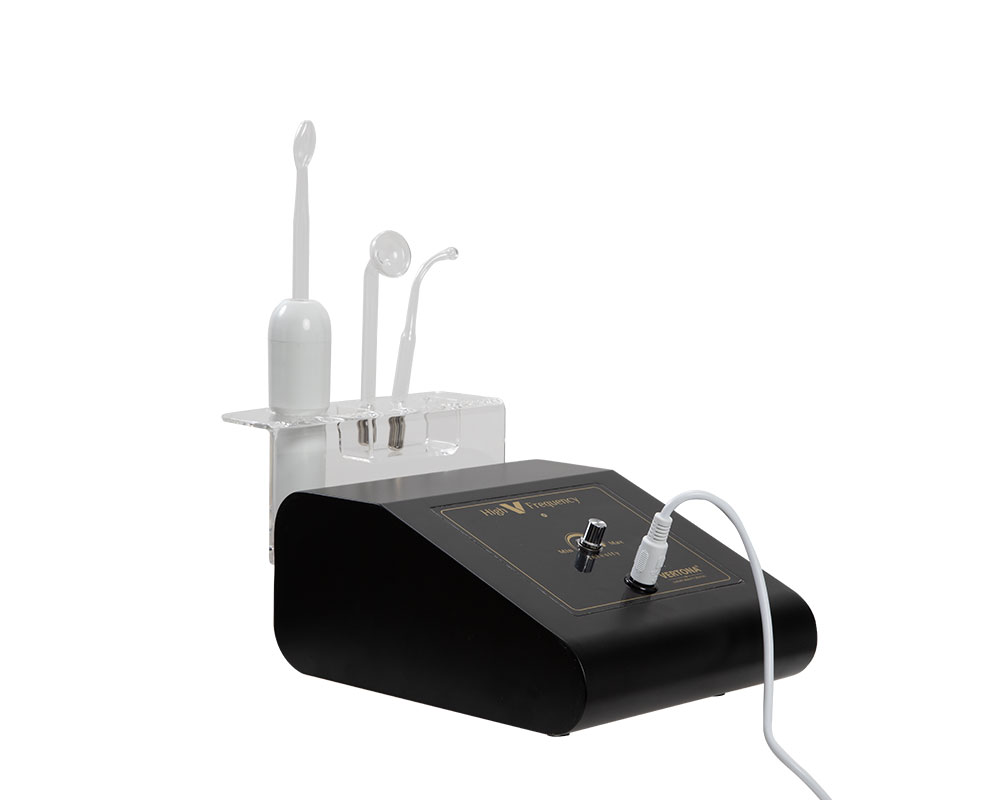 High V Frequency – D’Arsonval aparat radi u kombinaciji sa visokofrekventnim elektrodama koje su napravljene od prozirnog kaljenog stakla i dolaze u različitim oblicima i veličinama kako bi se olakšao tretman različitih delova lica i tela.