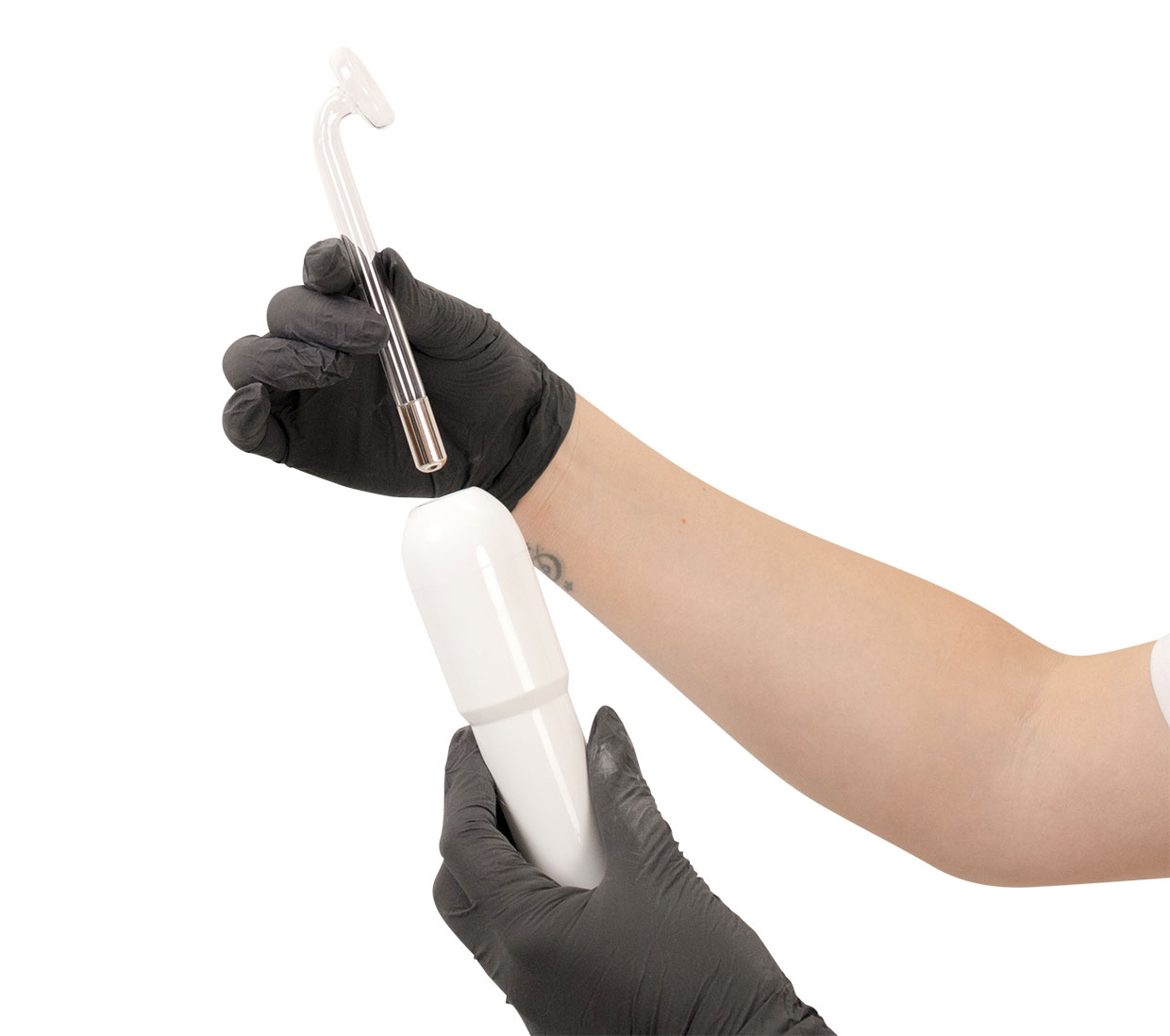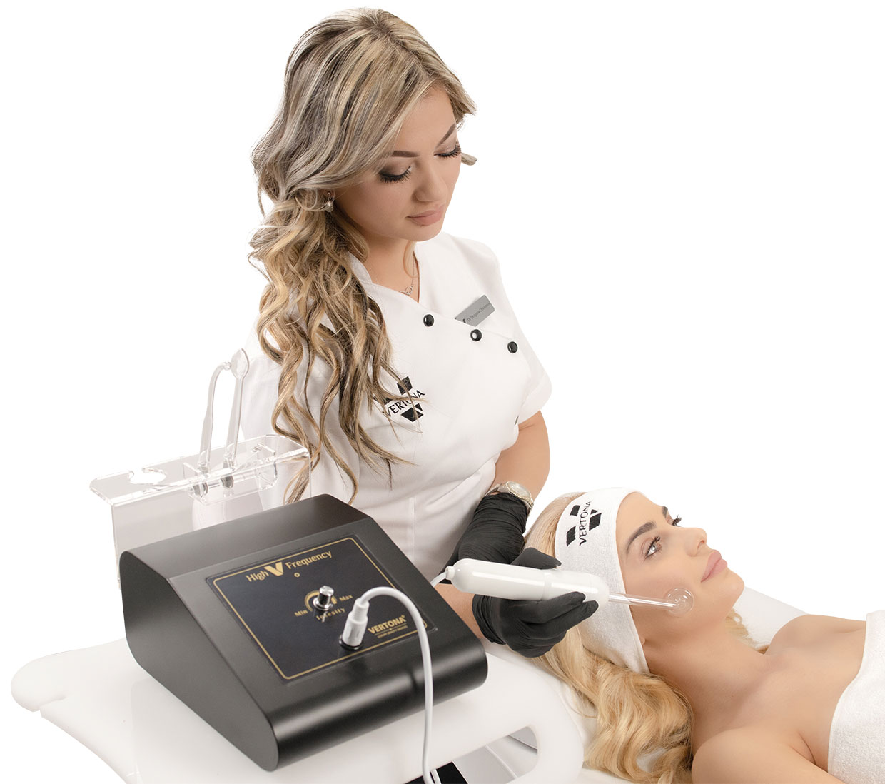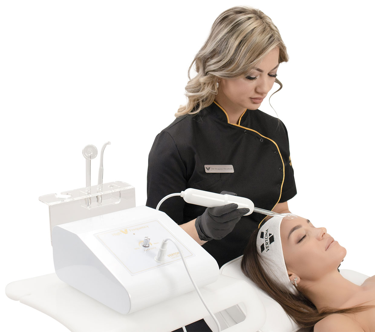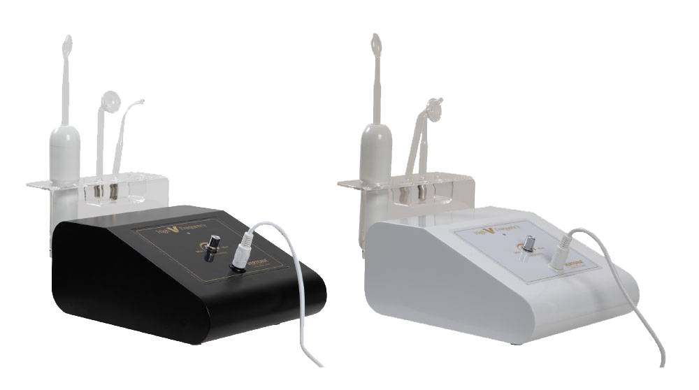 High V Frequency – D’Arsonval aparat radi u kombinaciji sa visokofrekventnim elektrodama koje su napravljene od prozirnog kaljenog stakla i dolaze u različitim oblicima i veličinama kako bi se olakšao tretman različitih delova lica i tela.