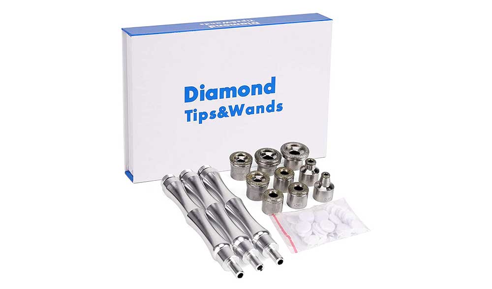 Set za mikrodermoabraziju sadrži 3 ručice, 9 dijamantskih glava različite veličine i granulacije, set pamučnih filtera 11mm i set pamučnih filtera 18mm